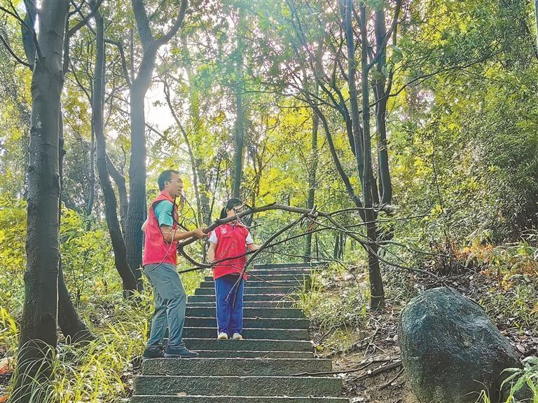 当天早上,在队长的带领下,新桥街道“民间林长”志愿服务队的志愿者们沿着蜿蜒山路有序推进,他们对山体滑坡隐患点、倒伏树木、松动护栏等展开细致排查。面对被狂风折断横亘在道路中央的树干,志愿者们分工协作,将其搬运至安全地带;针对被雨水冲刷散落的垃圾,大家手持垃圾袋、钳子等工具,仔细清理每一处卫生死角,全力保障山路整洁畅通。“山路湿滑,大家既要做好清理,更要注意自身安全!”队长不时提醒道,现场忙碌而有序。