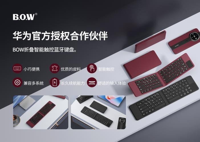 当你打开BOW与华为联合打造的智能折叠蓝牙键盘,折叠结构轻盈展开,立刻切入高效状态——无论连接手机、平板还是笔记本,皆可一键切换。