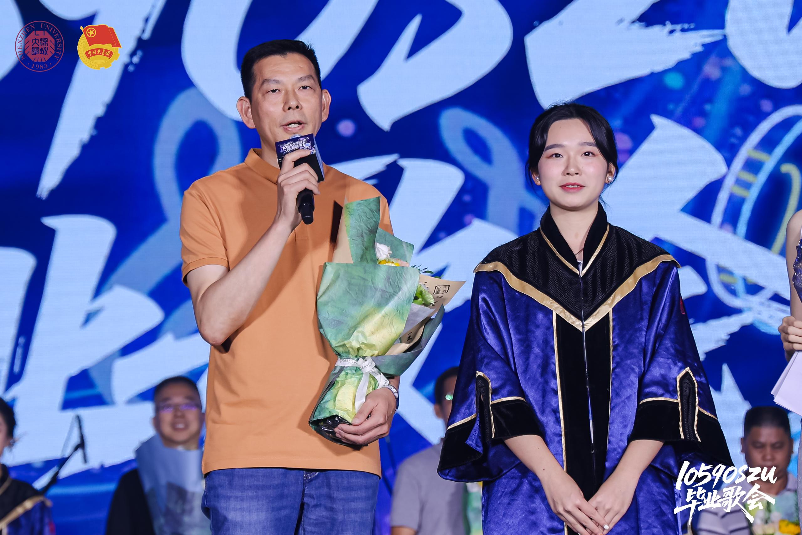 深圳大学校友、毕业歌会执行导演魏诗颖介绍,歌会节目安排与学生在校成长节奏一脉相承,恰逢父亲节,更以献花环节向父爱致敬,为这场毕业盛典注入了更深厚的人文情怀。受邀上台的毕业生父亲也激动地为深大送上祝福:“希望深大逐梦一流!”