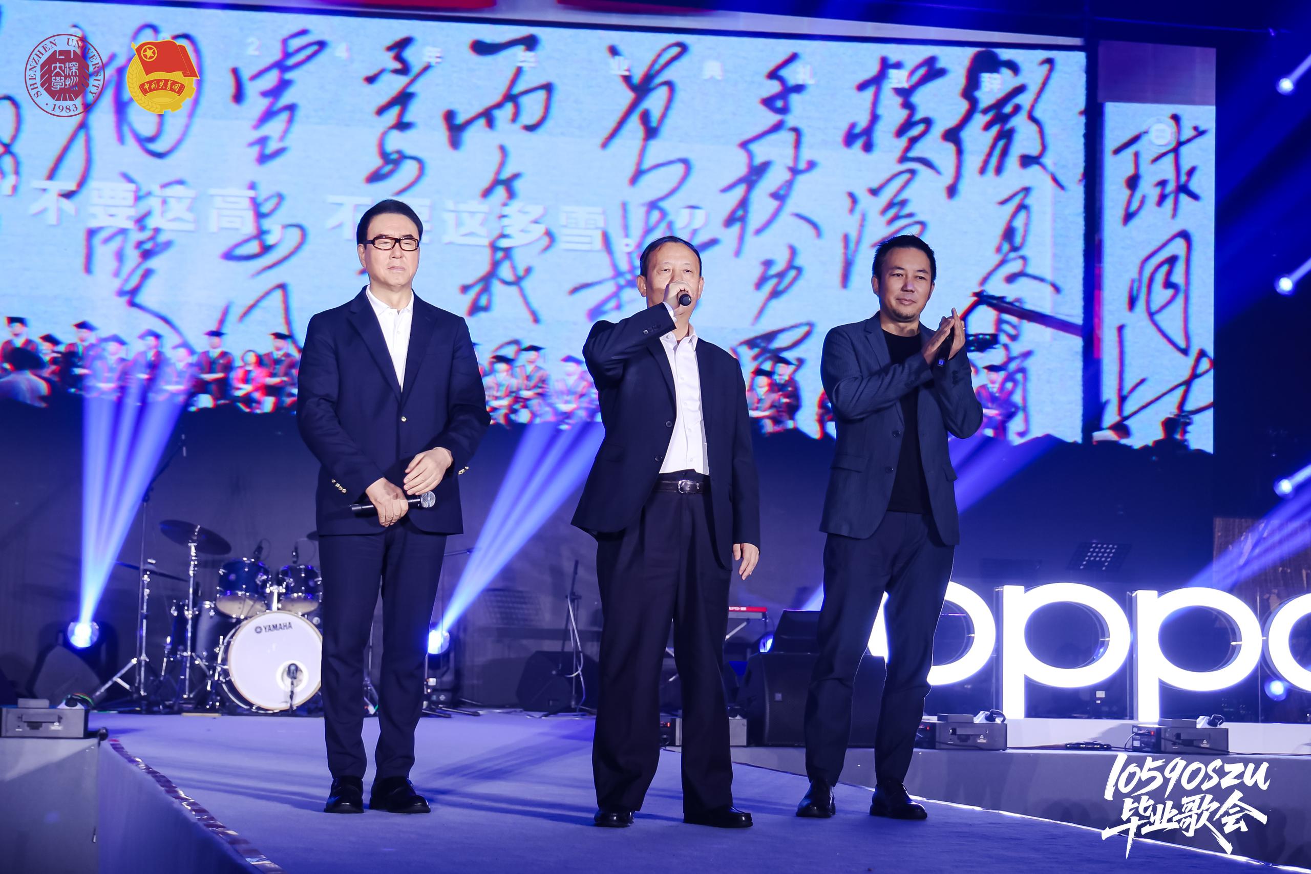 “毛校长,明天我们依然爱您!”“深大永远爱你们!”动情的演唱、澎湃激情的回答,歌会高潮迭起。毛军发携手何沐阳、郎昆同台演绎《明天你是否依然爱我》,三位嘉宾用歌声寄语毕业生:无论未来走向何方,母校永远是你们温暖的港湾!