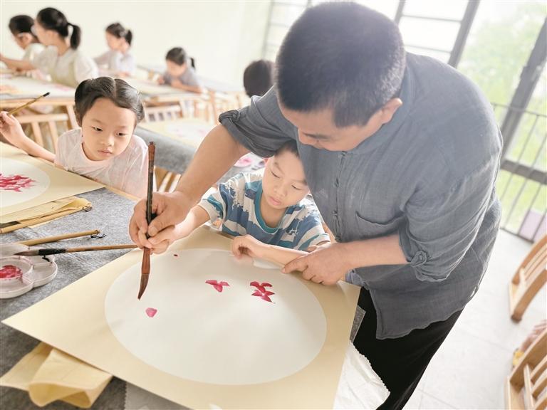 “孩子们,你们知道深圳市的市花是什么花吗?”话音刚落,坐在第一排的女孩迫不及待地站起来,自信满满地答道:“我知道,是三角梅!”随后,国画老师以深圳市市花三角梅(簕杜鹃)为主题,讲解其形态特征及绘画要点,让孩子们对这朵象征着深圳精神的花卉有了更深刻的认识。孩子们在老师的指导下创作出一幅幅色彩鲜艳、形态各异的作品。