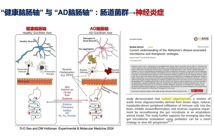 在全球药物研发困境中,中国科学家另辟蹊径,依据脑肠轴理论,原创了治疗AD药物甘露特钠(GV-971),它通过重塑肠道菌群,调节免疫系统,降低神经炎症,即通过调整“脑肠轴”实现改善认知及缓解病情。根据药物机理研究及I、II、III期临床研究结果 ,中国药监局在2019年有条件批准甘露特钠上市,成为世界上首个基于脑肠轴机制治疗AD的药物。