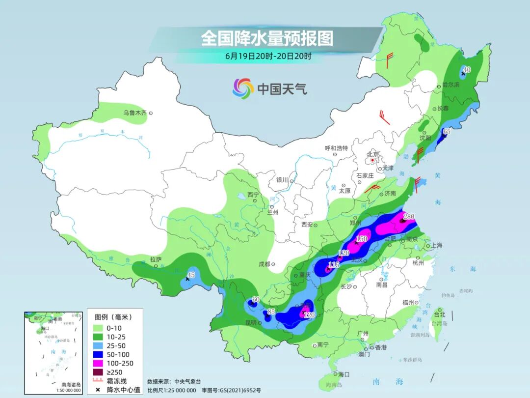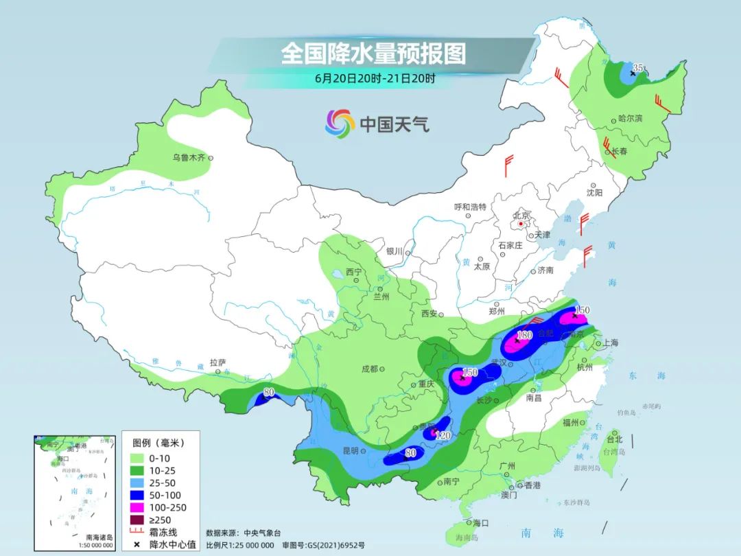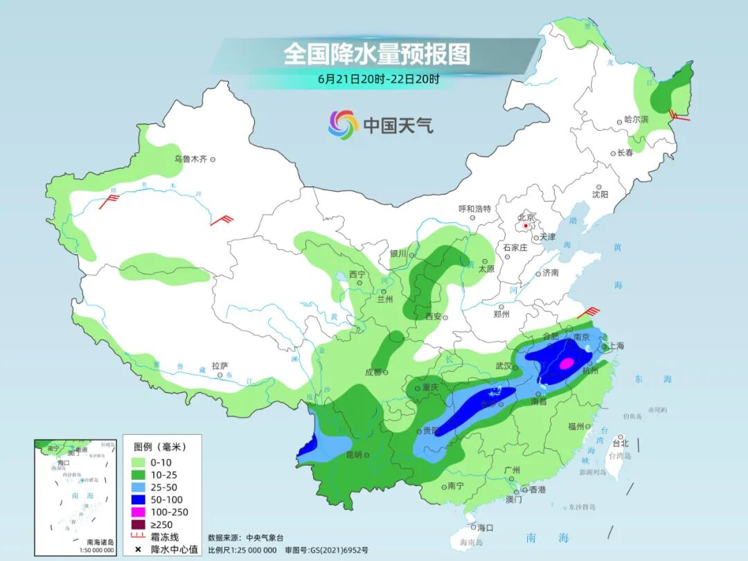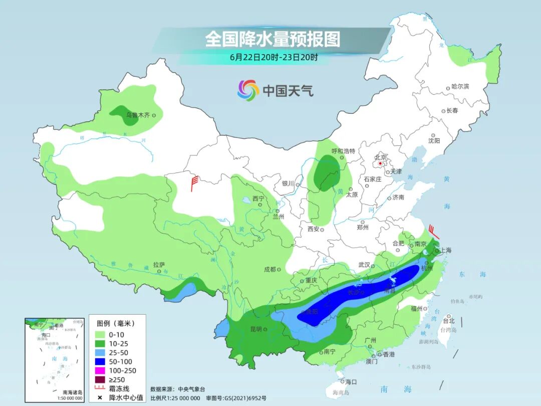 22日开始,降雨有所减弱,主雨带南压至江南一带,长江以南仍有不少暴雨,局地大暴雨。
