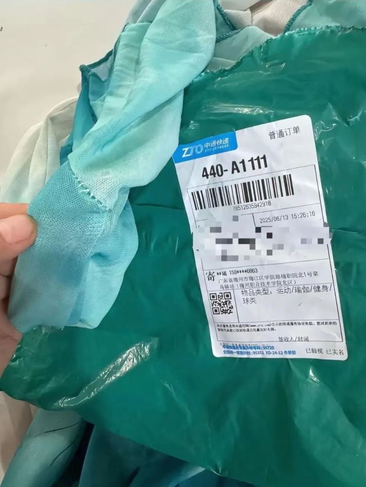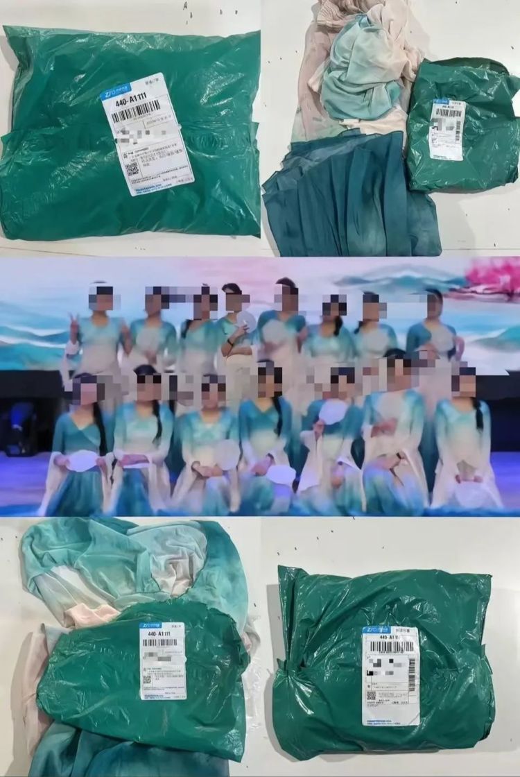 店主展示的包裹收货地址均为广东省梅州市梅江区学院路梅职院北1号菜鸟驿站,备注学校为梅州一职业技术学院北区。记者还注意到,其中一张演出截图中,十五名女生身着与店主展示几乎相同的演出服,上身为淡绿色上衣,下身为深绿色裤裙,在台上手拿扇子进行表演。