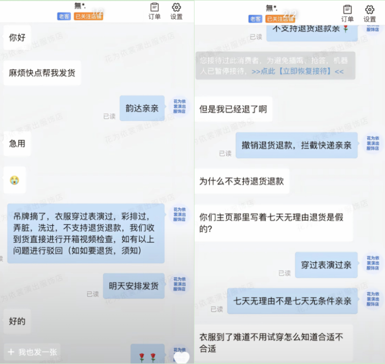 然而,演出结束后,买家却以“七天无理由退货”为由申请退款。店主以穿过为由拒绝退货,买家辩解“衣服不试穿怎么知道合适不合适”,即便店主发送学校演出视频作为证据,买家仍坚称“七天无理由为什么不能退”。