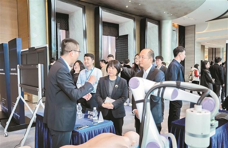 “宝医数智”大模型平台发布会现场,嘉宾了解智能艾灸机器人性能。