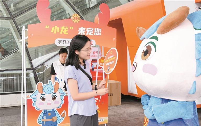 线下活动中,“小龙”走进职工群众集中场所,开展“知识问答+趣味游戏”的沉浸式宣传。首站走进龙华区数字创新中心工会大食堂,围绕“工会历史”“职工权益”设计知识题卡,“小龙”与职工面对面互动。“在吃饭时学知识,还能领小礼物,太实用了!”参与职工纷纷表示。第二站现身龙华设计产业园游园会,“小龙”带领职工边玩边学。“以前觉得工运知识枯燥,但‘小龙’一出现,氛围就轻松了!”一位职工说。