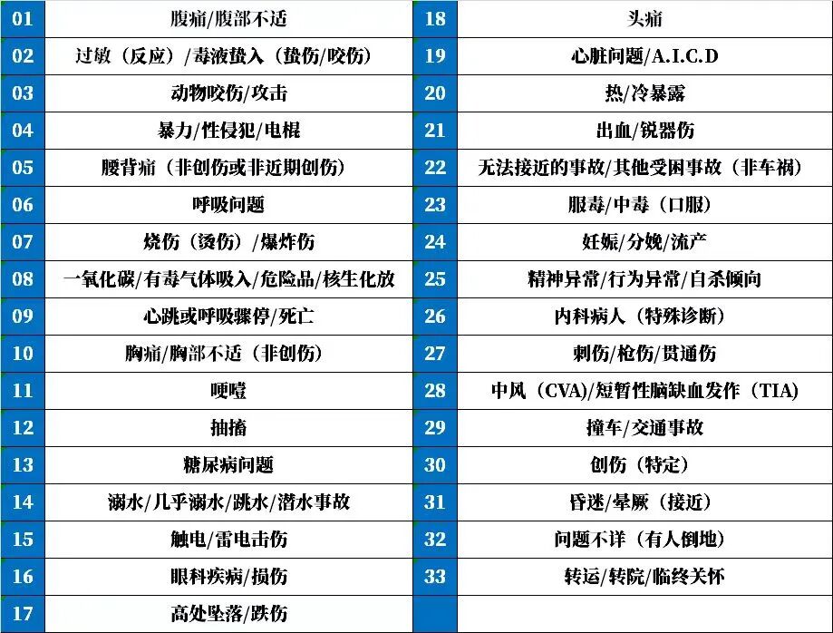 以上33类情况,可使用MPDS(急救医疗优先分级调度系统))指导现场人员施救。