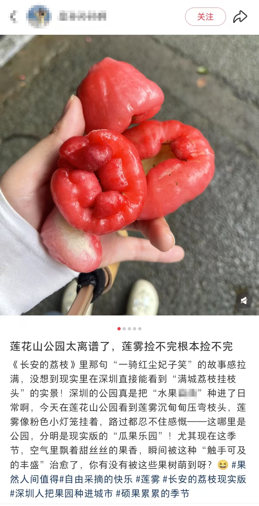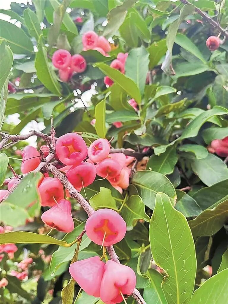 在莲花山公园,粉嘟嘟的莲雾简直是颜值天花板,像一串串小风铃挂在树上,连掉在地上都那么可爱,空气里都是清甜的香气,治愈感拉满。有市民说,早上散步闻着这味儿,一整天心情都好了。