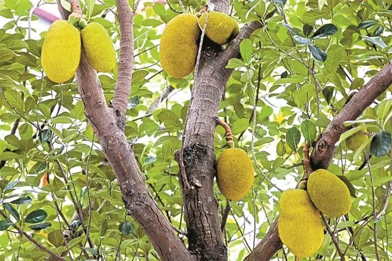 罗湖区红宝路旁,大树上结出硕大菠萝蜜果。深圳晚报记者 陆颖 摄