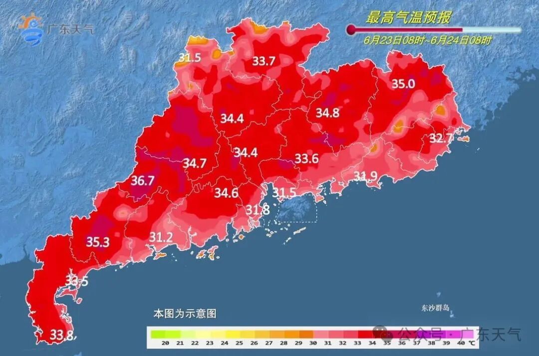 23-24日,广东省大部市县多云,局部有(雷)阵雨。最高气温:中北部市县33~36℃;其余市县31~33℃。