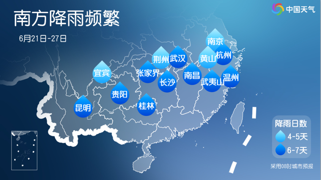 其中22日,江苏南部、上海、浙江北部、安徽南部、江西东北部、湖南中部、贵州东南部、广西北部、云南中南部等地的部分地区有大到暴雨,局地有大暴雨。
