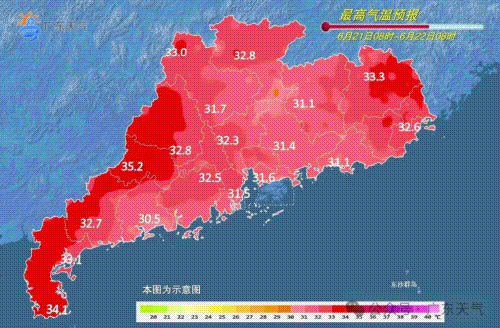 22日,广东省大部市县多云,局部有(雷)阵雨。最高气温普遍介于31~35℃之间。