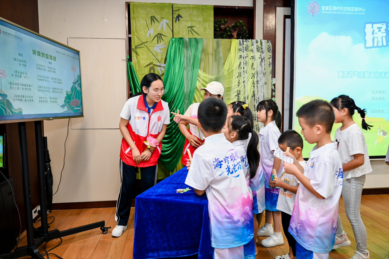 6月21日上午,宝安区新时代文明实践中心内洋溢着欢快而温馨的氛围,“探童趣 享夏韵”夏至节气主题文化活动暨“深圳市新时代文明实践集中活动日”宝安区分场活动在此举行。这场活动吸引了40组来自海天小学的亲子家庭,大家齐聚一堂,感受夏至节气中蕴藏的自然智慧与生活美学,传承文化脉搏,共绘文明新篇。