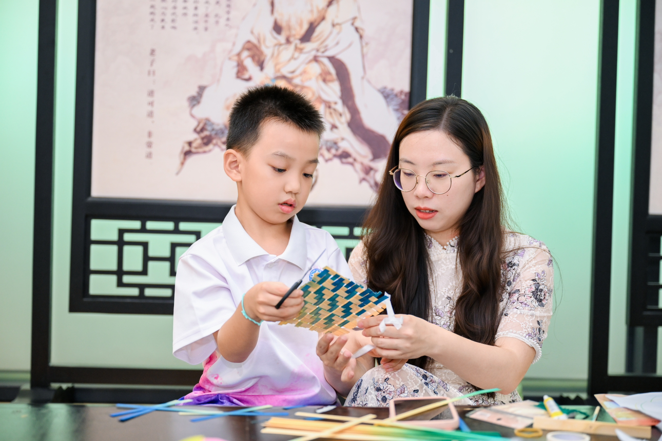 在“纸鸢祝福挂饰”手工区,五款造型各异、色彩斑斓的纸鸢挂饰吸引了孩子们的目光。他们在纸鸢上写下“夏至安康”“清风常伴”等祝福语,再将彩绳与铃铛巧妙地串联组装。非遗竹编环节更是亮点纷呈,非遗老师手把手教授竹篾编织技法,亲子合力制作竹编扇子,再以荷花刺绣点缀。一位母亲轻摇完工的扇子笑道:“这把扇子既有传统手艺的精致,又有亲手制作的温度,是夏天最好的礼物。”
