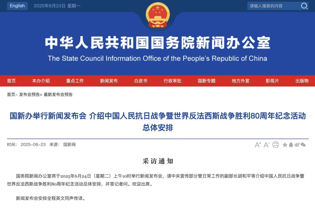 国务院新闻办公室将于2025年6月24日(星期二)上午10时举行新闻发布会,请中央宣传部分管日常工作的副部长胡和平等介绍中国人民抗日战争暨世界反法西斯战争胜利80周年纪念活动总体安排,并答记者问。