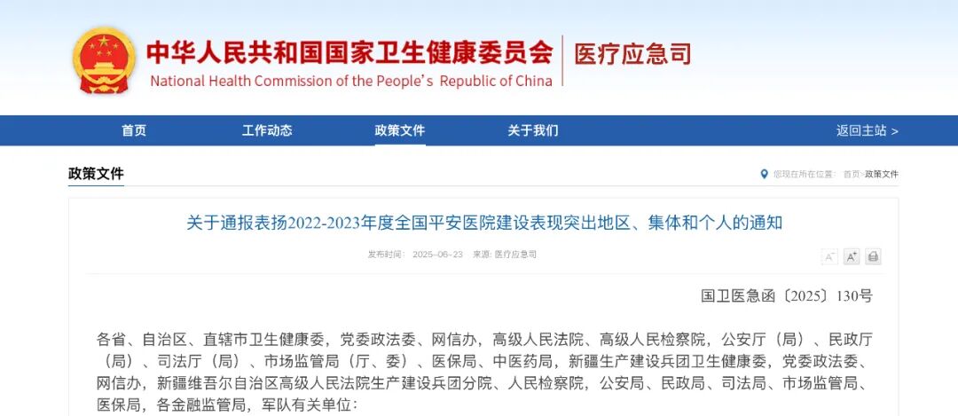 6月23日,国家卫健委、中央政法委、中央网信办等13个部委联合发文,通报表扬2022-2023年度全国平安医院建设表现突出地区、集体和个人。