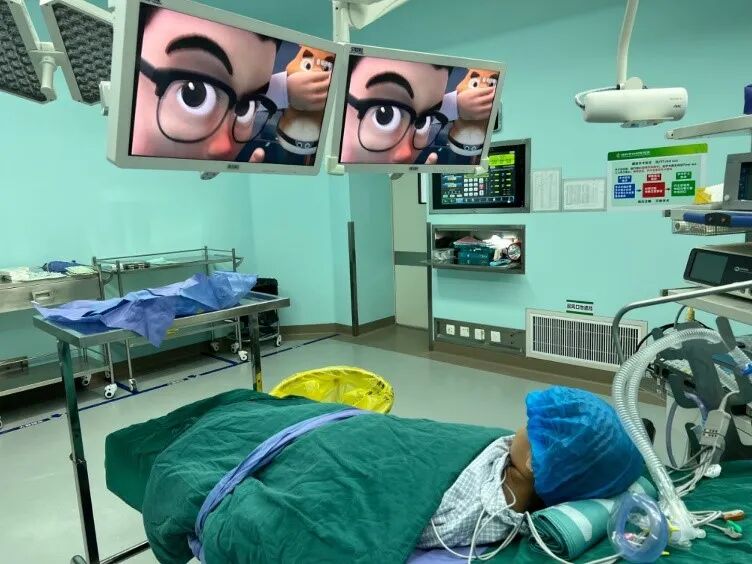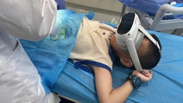 娃只要一戴上它,就会置身于一个虚拟现实环境中,在海底世界与鲨鱼游泳,或者和奥特曼一起打怪兽,不知不觉中手术就做完了。