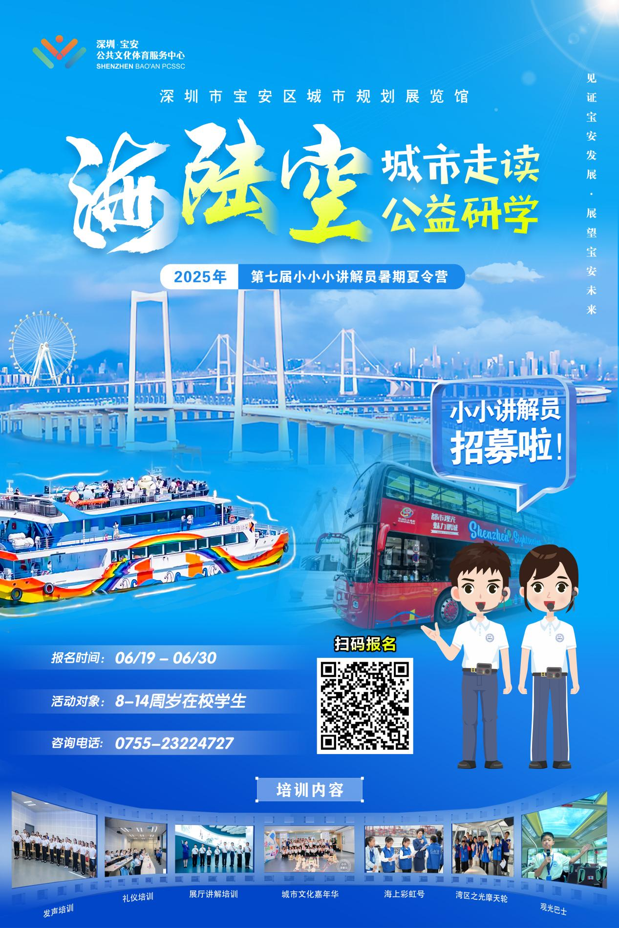 经过培训、指导及考核后,最终通过专业考核的学员将获得专属“服务工牌”,持续参与周末公益讲解服务,并有机会成为“深圳文旅推荐官”,前往宝安区城市规划展览馆及各景区讲解。表现优异者将获得“明星讲解员”“文旅小使者”等多项称号,更有机会参与宣传片拍摄及个人专访。本次实践活动将为10岁以上学员开通义工时登记通道。本次夏令营报名时间为6月19日-30日,录取名单将于7月8日公布。