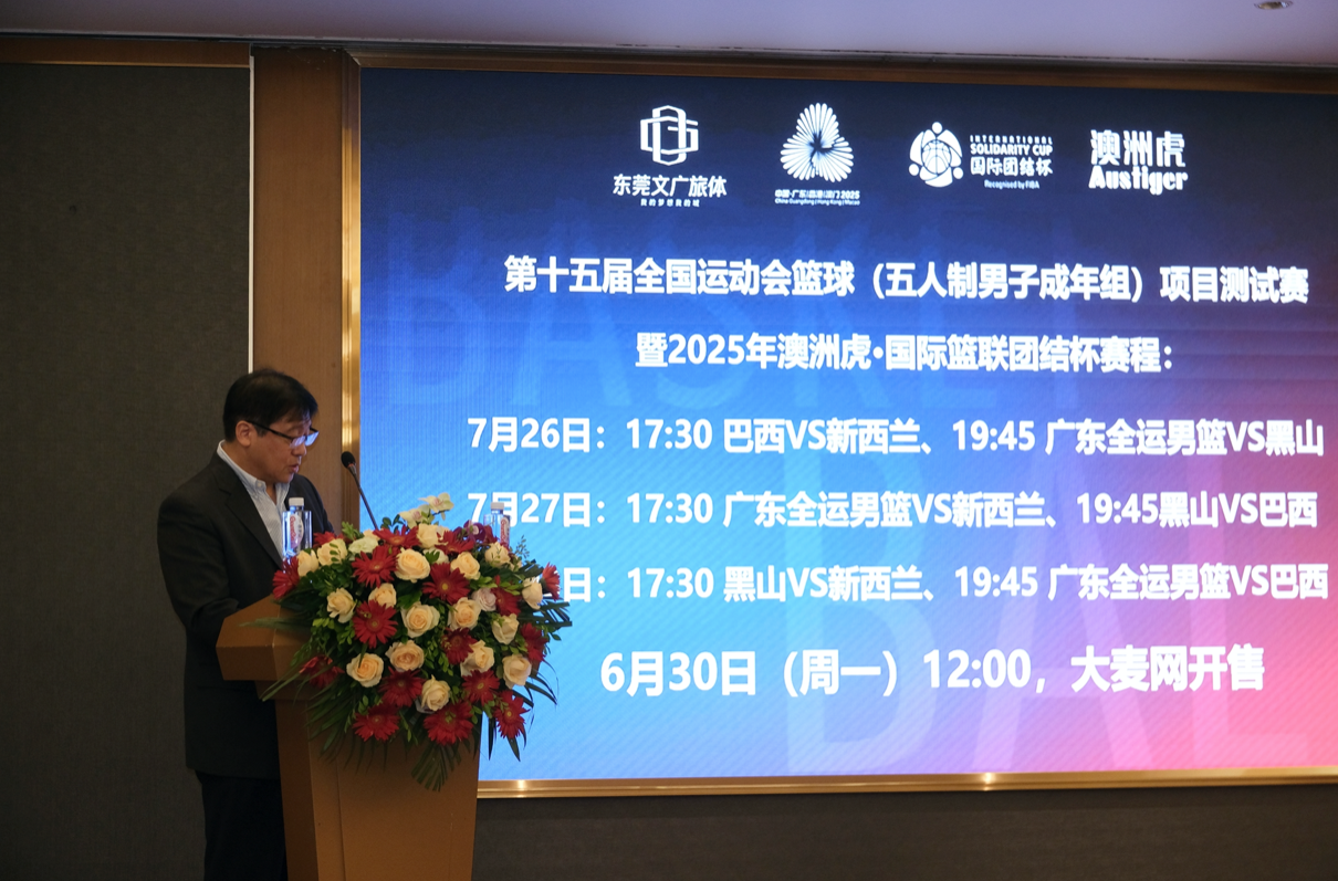 6月26日,第十五届全国运动会篮球(五人制男子成年组)项目测试赛暨2025年澳洲虎·国际篮联团结杯新闻发布会在东莞举行。国际篮联团结杯是国际篮联旗下的高水平国际赛事,列入国际篮联年度赛历。据介绍,今年的参赛队伍为奥运会八强巴西男篮、世界杯十六强黑山男篮、亚洲杯季军新西兰男篮,以及东道主广东全运男篮,比赛将于7月26日至28日在东莞市体育中心体育馆举行。
