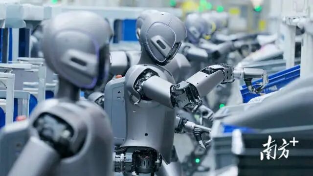 今年3月,数十台优必选工业人形机器人Walker S1开展了全球首例多台、多场景、多任务的协同实训。(图源:优必选)