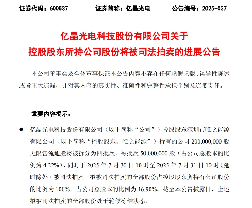 6月26日,亿晶光电(600537)发布公告,控股股东深圳市唯之能源有限公司所持有的2亿股无限售流通股将被拆分为四批次进行司法拍卖,每批次5000万股。此次司法拍卖完成后,亿晶光电控股股东及实际控制人或发生变更。