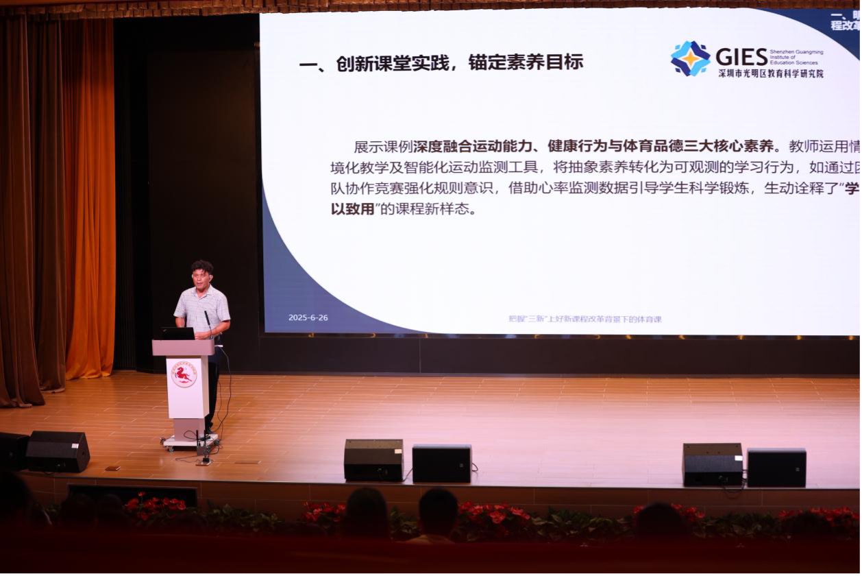 大鹏新区教科研中心体育教研员麦华飞带来《指向核心素养的课程实施路径》专题讲座,他从体育学科核心素养的内涵切入,深入剖析运动能力、健康行为、体育品德三大维度的内在联系与育人价值。为了让抽象的理论具象化,他结合生动教学案例,细致解析“学、练、赛”一体化实施策略。他说,教学实践符合新课标要求,围绕学年、学段、学期、课时教学计划一体化设计的思路,整体推进体育课堂教学,提高课堂教学质量。