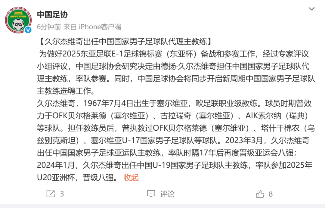 为做好2025东亚足联E-1足球锦标赛(东亚杯)备战和参赛工作,经过专家评议小组评议,中国足球协会研究决定由德扬·久尔杰维奇担任中国国家男子足球队代理主教练,率队参赛。同时,中国足球协会将同步开启新周期中国国家男子足球队主教练选聘工作。