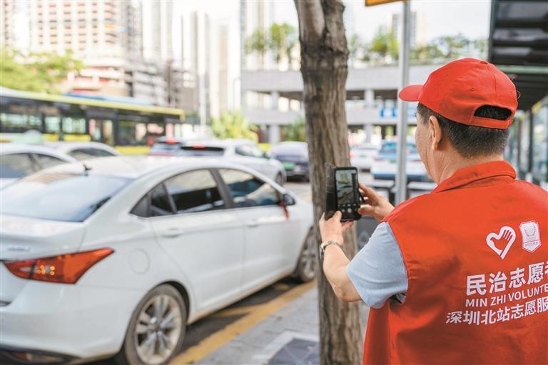 ▲民治志愿者在北站周边路段对违停车辆进行“随手拍”。