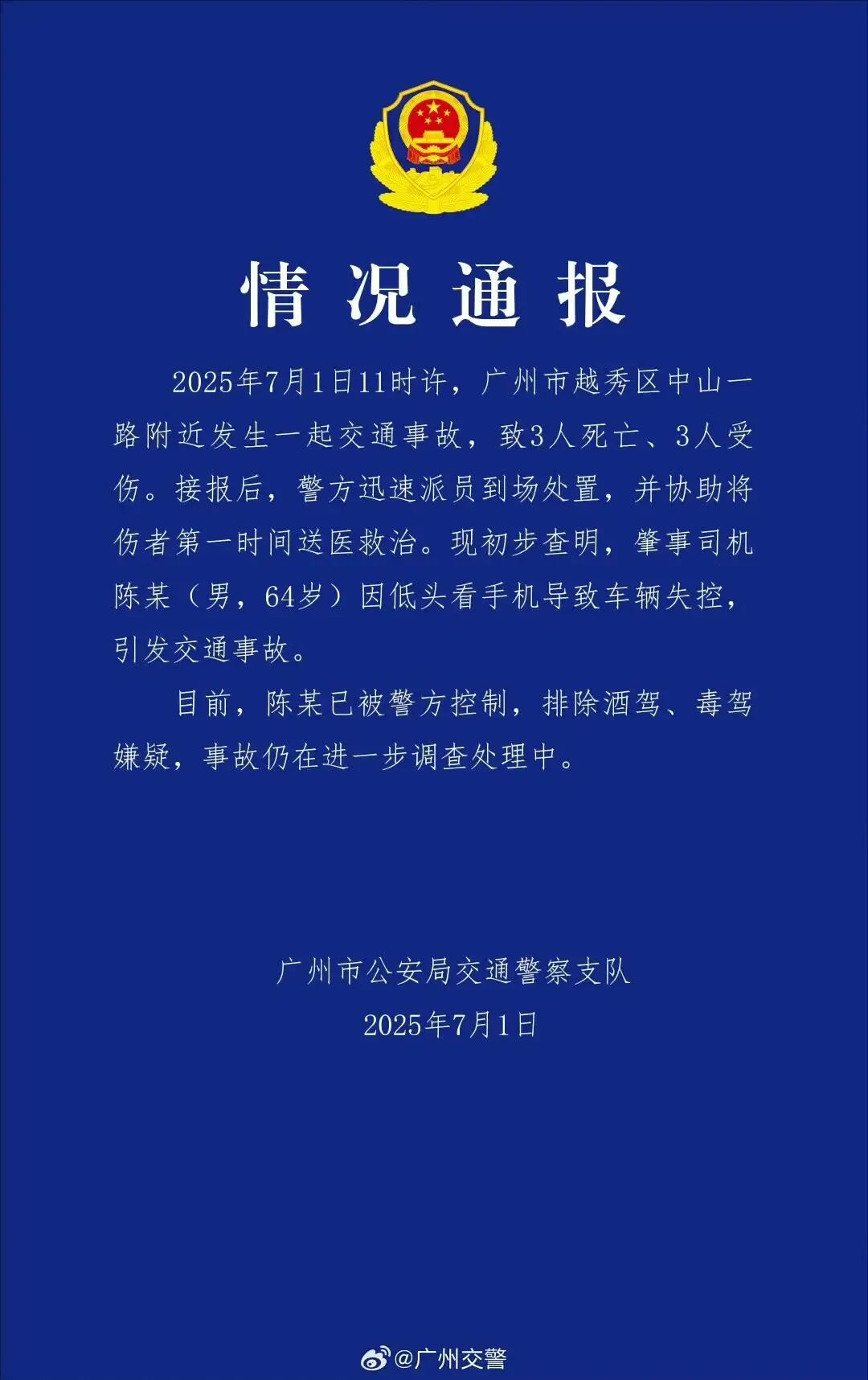 7月1日中午,广州交警发布一则情况通报:7月1日11时许,广州市越秀区中山一路附近发生一起交通事故,致3人死亡、3人受伤。
