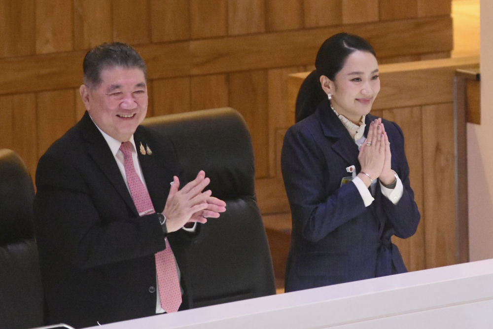 3月26日,在泰国曼谷,佩通坦(右)在不信任动议被否决后向人们致意。新华社发(拉亨摄)