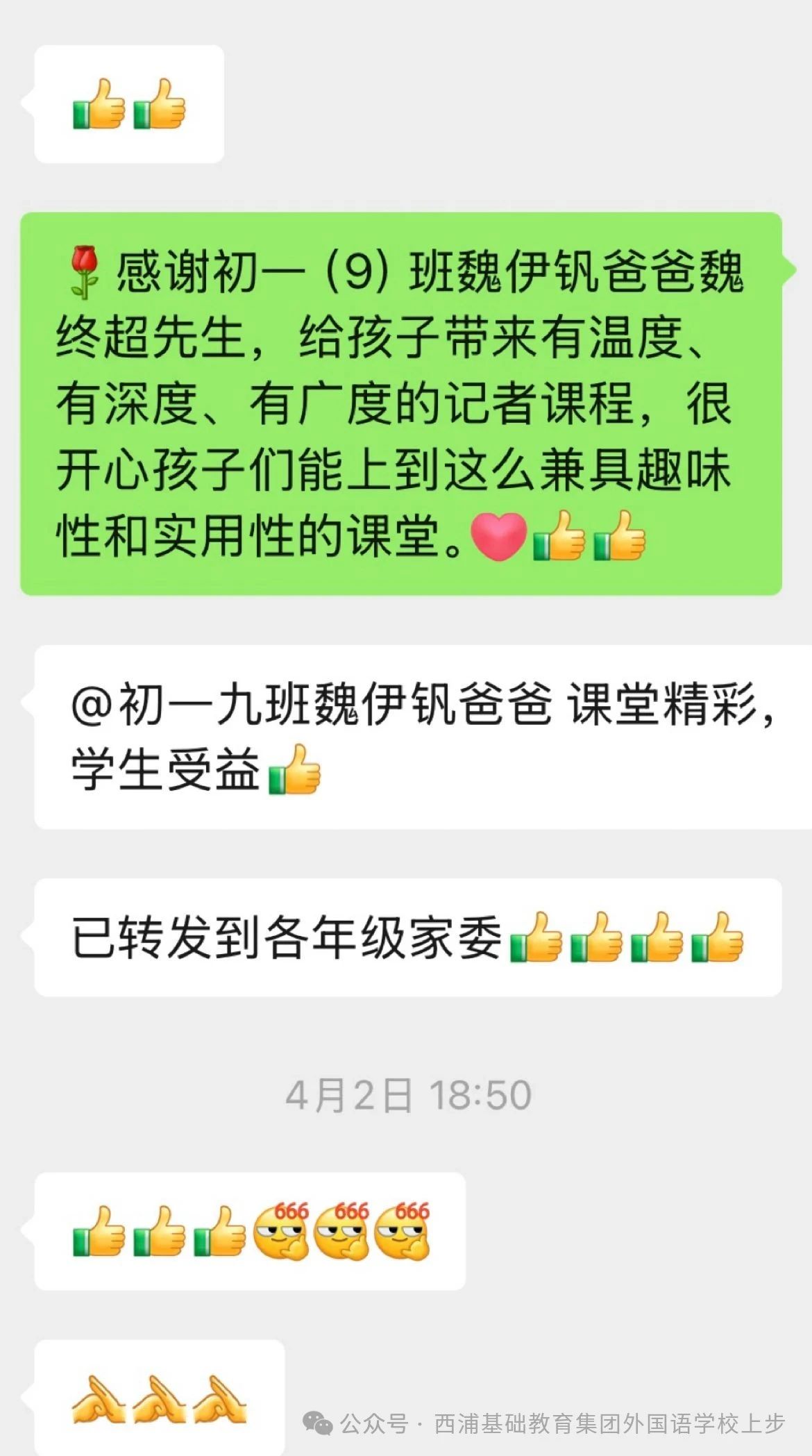 在本学期的西浦上步特色校本课程中,同学们迎来了一位特别的“老师”——他不是学校里的任课教师,而是来自初一(9)班魏伊钒同学的家长——魏终超先生。带着丰富的职业经验和一颗热忱的心,魏终超先生走进了课堂,为孩子们带来了一堂生动有趣、干货满满的职业启蒙课——《发现世界的眼睛:记者职业探秘》。