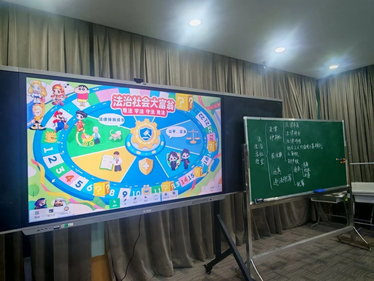 6月13日,何珂瑶老师执教研讨课《图解生活在法治社会》单元复习课。课堂通过"游戏闯关→图解深析→图谱共建"的可视化学习闭环,将传统的复习模式重构为"认知具象化-协作解构-系统建构"的法治素养培育路径。学生化身法治探险家,在完成关卡任务、绘图注解中深度践行"以图启智"的教学主张,有效解决了法律作用、法治德治关系等核心教学难点。