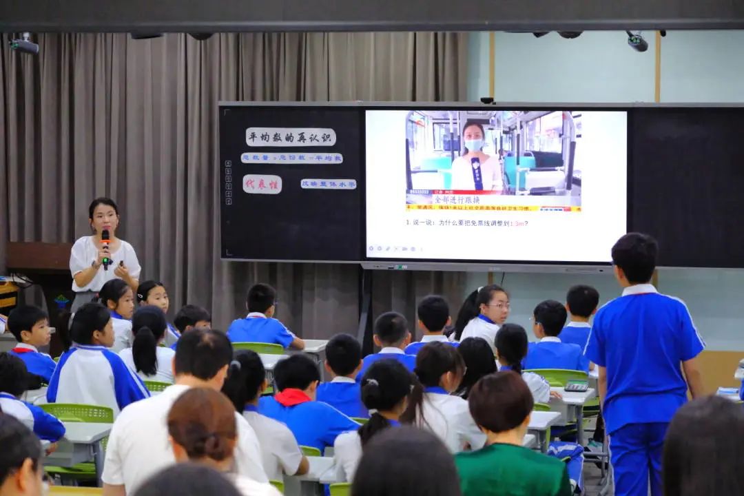6月4日,张莉老师执教研究课《平均数的再认识》,探索费曼学习法在小学数学课堂的创新应用。课堂通过解析 "1.3 米以下儿童免费乘车" 标准的制定逻辑,引导学生理解平均数在生活场景中的应用价值,以此来对应费曼学习法中“选定主题、理解概念”的核心步骤。继而以新苗杯选手得分数据为案例,对比分析去掉与保留极端数据时的得分及排位变化,使学生直观认识到平均数与每个数据的关联性,以及极端值对平均数的显著影响,在讨论中深化概念理解。