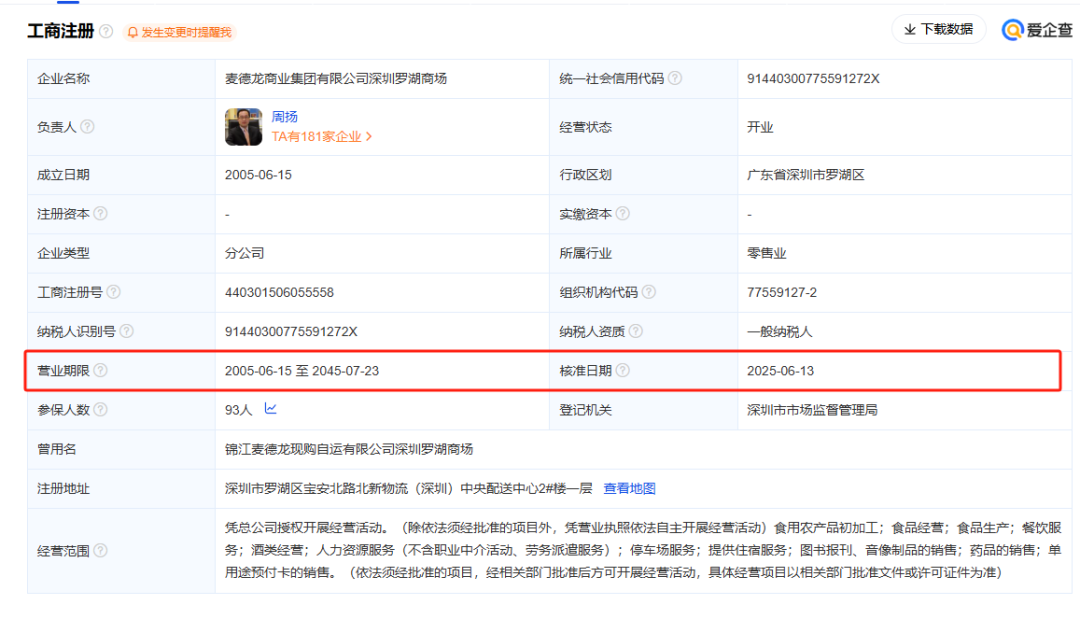 据公开信息,麦德龙商业集团有限公司深圳罗湖商场的营业期限6月13日核准为2005年6月15日至2045年7月23日,注册地址为深圳市罗湖区宝安北路北新物流(深圳)中央配送中心2#楼一层。
