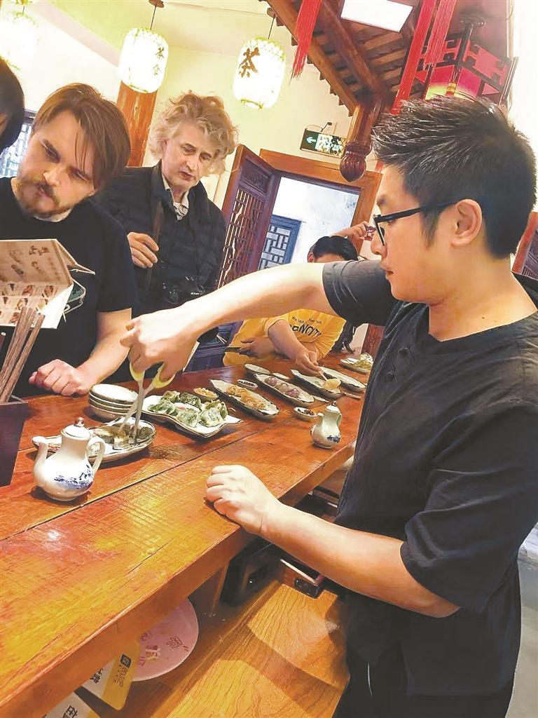 ▲陈海涛为外国友人介绍壹米食潮汕传统小吃。
