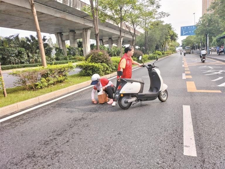 与此同时,志愿者唐群彩也迅速赶来协助。两人默契配合:毛了媛负责照看伤者,唐群彩则立即将倒地的电动车扶起并推至路边安全区域,既避免了交通堵塞,又防止了二次事故的发生。经初步检查,发现该女士的手掌和膝盖有多处擦伤,伤口正在渗血。毛了媛一边用随身携带的纸巾为伤者简单处理伤口,一边轻声安慰:“别担心,伤口不深,但最好还是去医院检查一下。”并建议女士立即联系家人。