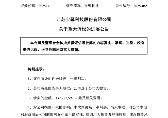 7月4日晚间,宝馨科技(002514)披露,在安徽大禹实业集团有限公司提起的重大诉讼中,公司及子公司作为被告,被判返还原告出资款3亿元及相关财务成本,财务成本按年利率4.65%计算,另外还需支付律师费29万元。