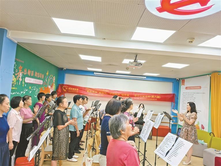 课堂上,资深声乐老师以歌曲《万水千山总是情》为范本,逐字拆解粤语发音,“‘万水千山’的‘山’字,舌尖抵住上齿龈,尾音自然上扬。”从咬字归韵的技巧,到情感倾注的要点,带领大家领略粤语歌曲的魅力。合唱加入的钢琴伴奏,如同一股温柔的潮水,激荡着大家怀旧的情愫。在互动环节,大家分享与粤语歌的难忘故事。居民高女士高兴地提起年轻时的趣事,“当年只记得《上海滩》那句‘浪奔浪流’,在村里哼着走调的旋律,总被人笑话。经过多年演练,现在越来越会唱粤语歌了,社区里还有不少粉丝呢。”甲子塘社区相关负责人表示,社区将持续挖掘经典粤韵资源,开展更多音乐活动,让“甲韵新声”凝聚民心,让幸福歌声在社区久久回荡。