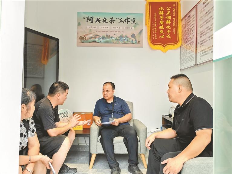 王灵典(右二)创立“阿典夜茶”工作室,为居民化解矛盾纠纷。
