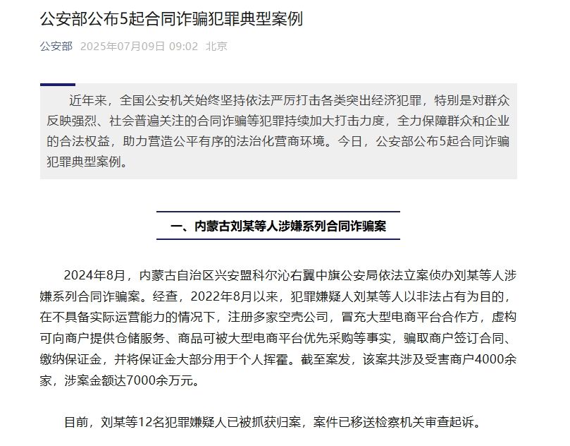 2024年8月,内蒙古自治区兴安盟科尔沁右翼中旗公安局依法立案侦办刘某等人涉嫌系列合同诈骗案。经查,2022年8月以来,犯罪嫌疑人刘某等人以非法占有为目的,在不具备实际运营能力的情况下,注册多家空壳公司,冒充大型电商平台合作方,虚构可向商户提供仓储服务、商品可被大型电商平台优先采购等事实,骗取商户签订合同、缴纳保证金,并将保证金大部分用于个人挥霍。截至案发,该案共涉及受害商户4000余家,涉案金额达7000余万元。