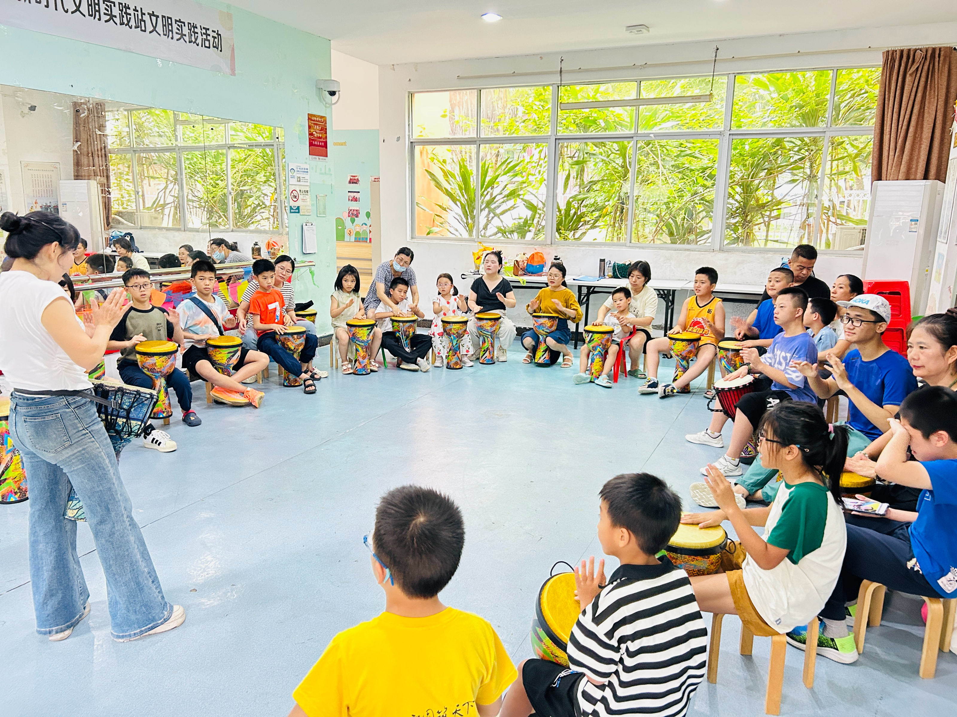 面向孩子们的活动同样丰富。如一直深受孩子们喜欢的“艺术赋能,共奏天籁”慢飞天使梦想乐团非洲鼓兴趣班。在专业老师的指导下,“慢飞天使”们热情高涨地学习非洲鼓演奏技巧。教室里鼓声阵阵、节奏明快,孩子们跟随节拍,用双手敲打出充满活力的鼓点。非洲鼓兴趣班不仅为特殊儿童提供了接触艺术的机会,更通过音乐搭建起他们与外界沟通的桥梁,帮助他们培养节奏感和专注力,在艺术的熏陶中增强自信心与社交能力。
