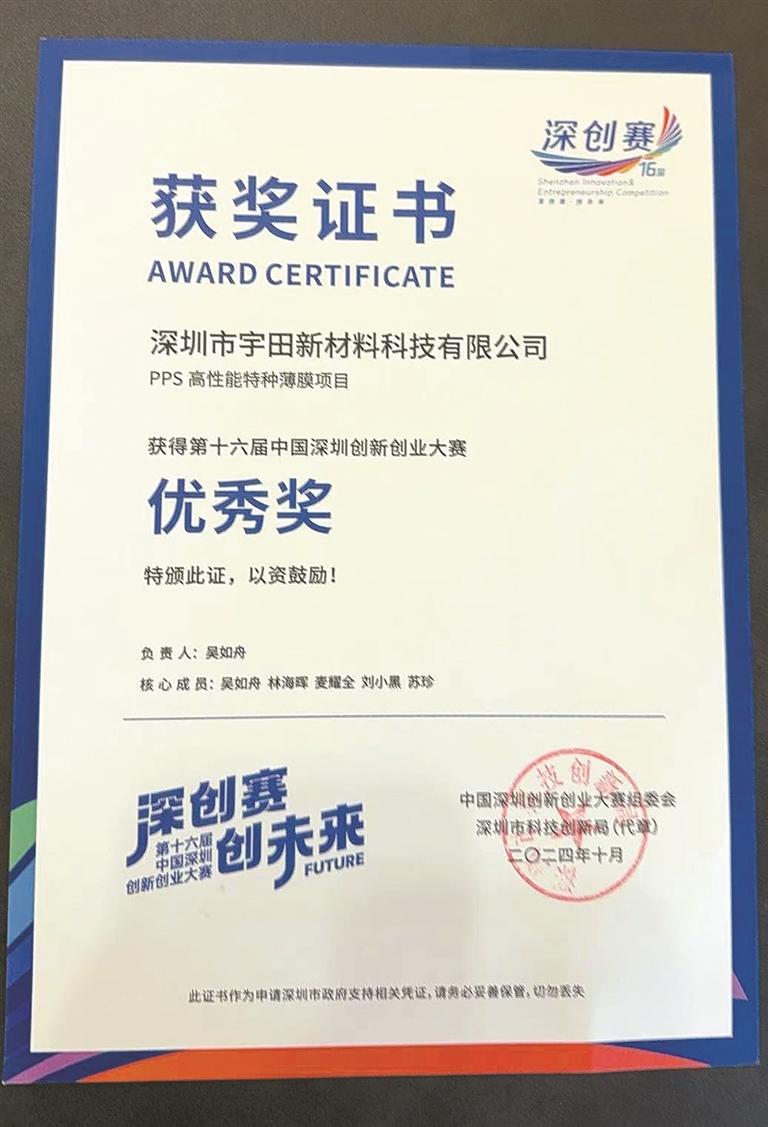 宇田新材于2022年10月成立,在董事长吴如舟的带领下,以时不我待、只争朝夕的精神,克服种种困难,研发并建立世界一流的核心技术平台。凭借完全自主知识产权,公司国内首创PPS双面拉伸薄膜(PPS,英文名为PolyPhenylene Sulfide,中文名为聚苯硫醚,是一种半结晶材料,具有极好的耐高温、耐化学品、流动性、尺寸稳定性等综合性能),产品性能达到行业领先水平。在2024年“光创赛”上,该公司参赛项目获得节能环保新材料行业二等奖。同时,在2024年“深创赛”上,该公司参赛项目获得优秀奖。