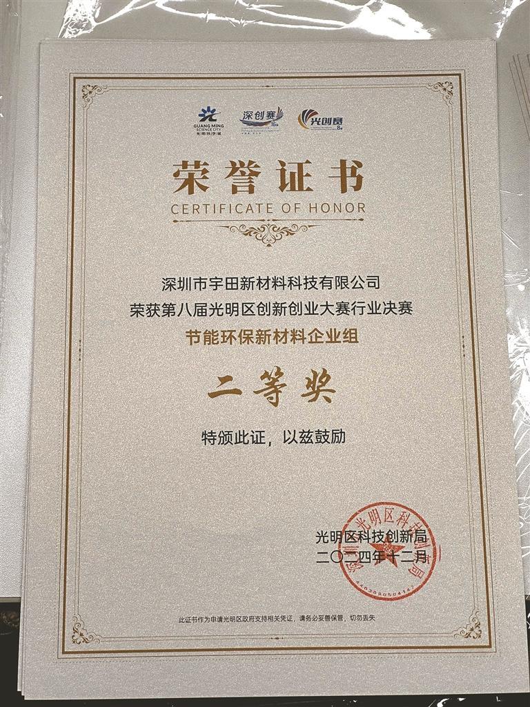 吴如舟表示,选择光明是经过多方考量的战略决策。光明区作为深圳重要的产业创新高地,在新材料领域已形成完备的产业链条,上下游企业聚集,便于公司实现资源共享与协同发展;光明人才资源丰富,与多所高校、科研机构建立合作,为企业吸引高端人才提供了便利;光明区良好的营商环境和便捷的交通物流条件,为企业发展提供了坚实基础。另外,在企业发展过程中,光明区给予全方位的产业政策支持。比如,在研发投入上,为企业提供研发补贴与税收优惠,助力企业加大技术创新力度;在人才引进方面,推出人才安居、子女教育等配套政策,帮助企业吸引和留住优秀人才;光明区搭建产学研合作平台,促进企业与科研机构深度合作,加速科技成果转化。这些政策支持为宇田新材成长提供了强大动力。