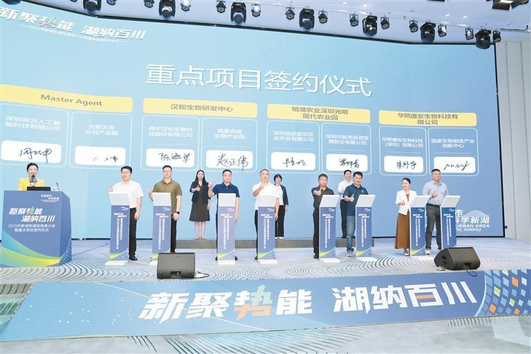 近年来,新湖街道全面发力“双招双引”,跑出了产业发展加速度。本次大会上,新湖街道重点推介了新一代信息技术、新材料、生物医药、合成生物等四大主导产业集群的发展成果,并举行项目签约仪式。其中,深元人工智能研发的“Master Agent”L4级智能体母体、汉和生物设立研发中心等8个重点项目现场签约。