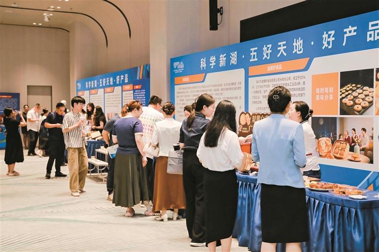 当天参会企业家大多数来自外地,为了让他们更直观了解新湖,会场还精心策划了“科学新湖·五好天地”展区。300平方米的展区分为“好空间”“好商圈”“好项目”“好产品”“好楼盘”五大特色板块,通过数字化展示和实物体验相结合的方式,为参会企业家提供沉浸式观赏体验。