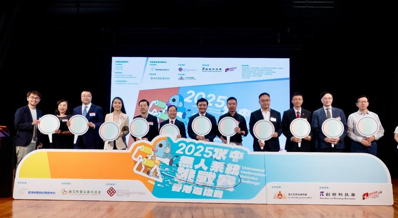 在庄重而热烈的启动仪式上,创新科技及工业局数字政策专员黄志光JP,中联办九龙工作部副部长李文彬先生,油尖旺民政事务专员余健强JP,全国政协委员、油尖旺爱心慈善基金主席车弘健先生,香港科普科幻教育中心发起人、北京元宇科幻未来技术研究院副院长陈柳岐女士,油尖旺社团联会会长杨子熙BBS,MH,香港特区立法会议员、香港高才通人才服务协会创会会长尚海龙,油尖旺爱心慈善基金创会主席潘陈爱菁SBS. JP,油尖旺爱心慈善基金永远荣誉主席陈丽芳博士,JP、香港科普科幻教育中心董事李家轩先生,香港理工大学深空探测中心副主任吴波教授,联合电子出版有限公司总经理周晟,香港海事博物馆董事冯锦荣博士共同进行了象征“深蓝探索”的启动仪式,标志着2025年“水中无人系统挑战赛”香港选拔赛正式开始。