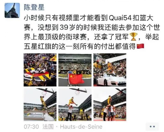 北京时间7月6日凌晨,法国Quai54街球赛扣篮大赛现场传来令人振奋的消息。来自浙江、身高1.76米、39岁的陈登星,一举夺得该项赛事冠军。