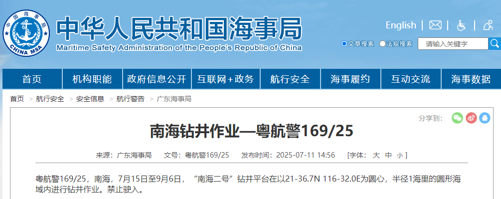 广东海事局发布航行警告,7月15日至9月6日,“南海二号”钻井平台在以21-36.7N 116-32.0E为圆心,半径1海里的圆形海域内进行钻井作业。禁止驶入。