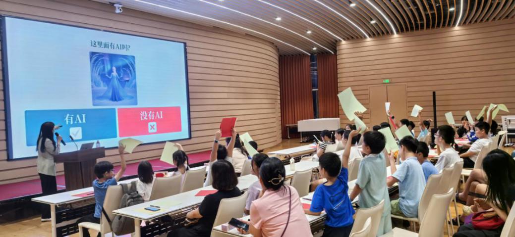 “扫地机器人会思考吗?”“美颜相机有大脑吗?”随着“AI猜猜看”互动游戏火热开启,孩子们争相点击屏幕上展示的智能音箱、计算器等日常物品,现场惊呼声此起彼伏。当自动驾驶汽车的图片亮起时,全场家长几乎一致举起了“有AI”的答题板,生活与科技的边界在轻松的笑声与互动中悄然消融。